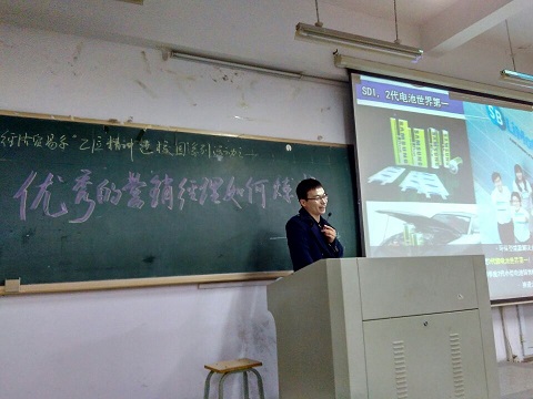 2017年12月1日下午,经贸系市场营销专业在教学楼A416教室举行“不畏难,不畏小——优秀营销经理如何炼成”专题讲座,市场营销专业16级、17级在校生、经贸系其他专业学生和教师共120余人参加。本次讲座由三星公司安徽分公司经理孙义主讲。孙经理结合自身十余年行业经历,认为营销工作也需要弘扬工匠精神,并以自己入职以来在不同企业从事房产经纪、电器销售与半导体营销的丰富经验为例,强调市场营销专业同学要立足营销岗位,“不畏难,不畏小”,专心致志,坚持不懈,坚信办法总比困难多,只要愿意改变,营销工作才会有未来,个人才会取得成功。